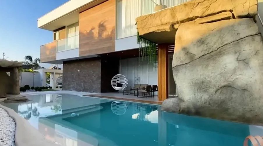 Com três andares e piscina aquecida, o imóvel conta também com lavabo, cozinha, área de serviço, dependência completa, três suítes, closet e um banheiro de luxo.