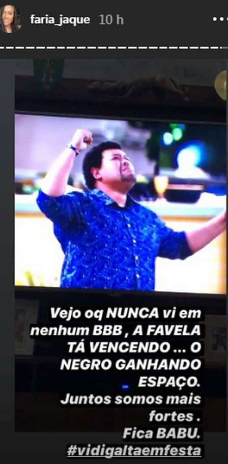 A ex-BBB Jaque Faria até chegou a lançar a hashtag “Vidigal em festa“. E a atriz Roberta Rodrigues compartilhou uma conversa com um amigo relatando as comemorações na favela. “Vejo o que nunca vi em nenhum BBB: a favela está vencendo, o negro está ganhando espaço. Juntos somos mais fortes“, escreveu Jaque.