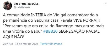 “Morro do Vidigal comemorando que o Babu ficou. Isso se chama representatividade. Ninguém da favela sabe o que é primeira, segunda ou sei lá o que de onda feminista. Eles sabem o que é passar fome. Aprendam militantes. É com essa gente que vocês precisam dialogar“, analisou outra seguidora.