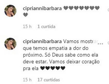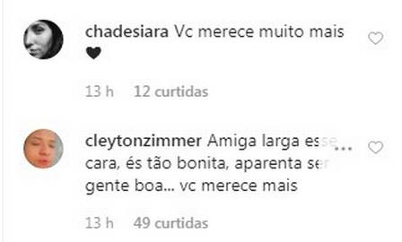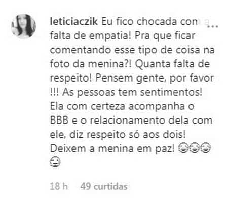 Eu fico chocada com a falta de empatia! Pra que ficar comentando esse tipo de coisa na foto da menina? Quanta falta de respeito! Pensem gente, por favor! As pessoas têm sentimentos! Ela com certeza acompanha o ‘BBB’ e o relacionamento dela com o Petrix, diz respeito só aos dois. Deixem a menina em paz!”, incentivou uma segunda.
