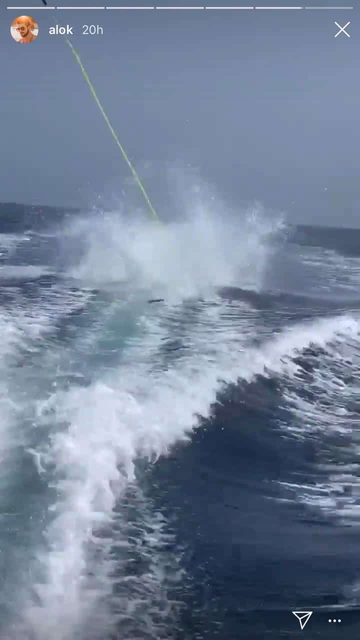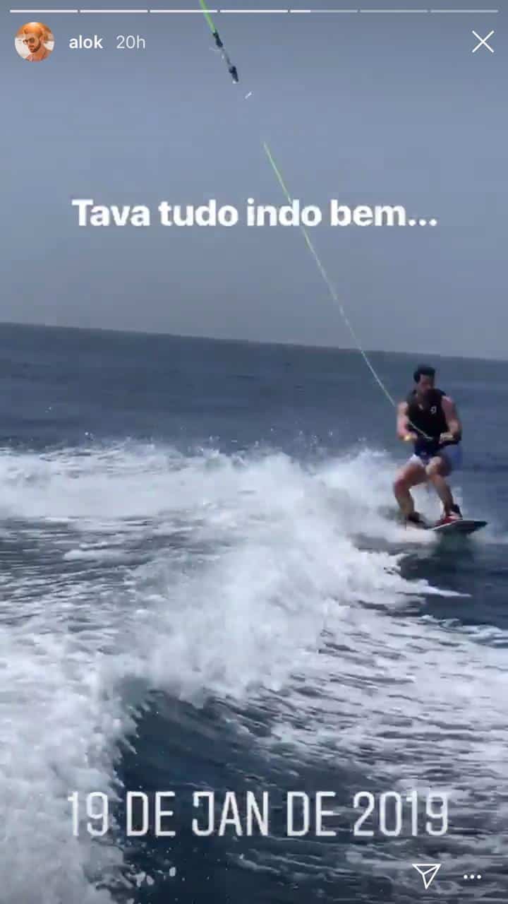 Na sequência de vídeos, Alok estava praticando esqui aquático, quando se desequilibrou e acabou caindo. Na queda, o artista se machucou.