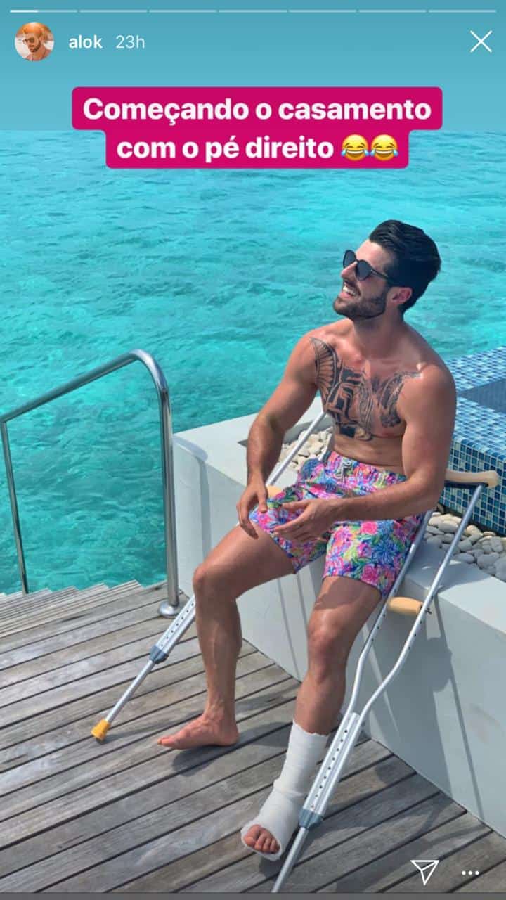 Vivendo um momento super romântico, Alok acabou passando por uma situação inesperada neste fim de semana. O DJ, que está em lua de mel nas Ilhas Maldivas com sua esposa, Romana Novais, se machucou e precisou imobilizar o pé.