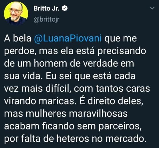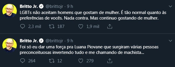 Britto Jr foi atacado ferozmente por dezenas de seguidores logo após as declarações. “Foi só eu dar uma força pra Luana Piovani que surgiram várias pessoas preconceituosas invertendo tudo e me chamando de machista…”, reagiu, revidando os ataques. “LGBTs não aceitam homens que gostam de mulher. É tão normal quanto às preferências de vocês. Nada contra. Mas continuo gostando de mulher”, completou.