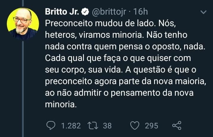Britto Jr não parou com as afirmações descabidas. No mesmo post, o famoso afirmou que o preconceito mudou de lado e que os heterossexuais se tornaram a minoria. “Preconceito mudou de lado. Nós, héteros, viramos minoria. Não tenho nada contra quem pensa o oposto, nada. Cada qual que faça o que quiser com seu corpo, sua vida”, ressaltou.