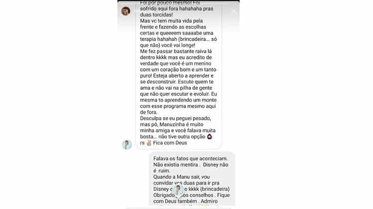 “Esteja aberto a aprender e desconstruir. Escute quem te ama e não vai na pilha de gente que não quer escutar e evoluir. Eu mesma estou aprendendo um monte com esse programa mesmo aqui de fora. Desculpa se peguei pesado, mas pô, Manuzinha é minha amiga e você falava muita b****. Não tive outra opção. Fica com Deus”, desabafou a artista.