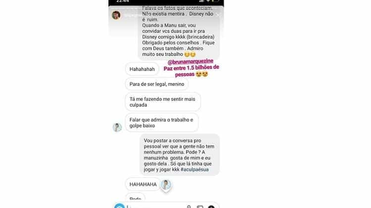 Felipe Prior finalizou dizendo que iria postar a conversa e Marquezine concordou. “A Manuzinha gosta de mim e eu dela. Só que tinha que jogar y jogar”, disse ele.