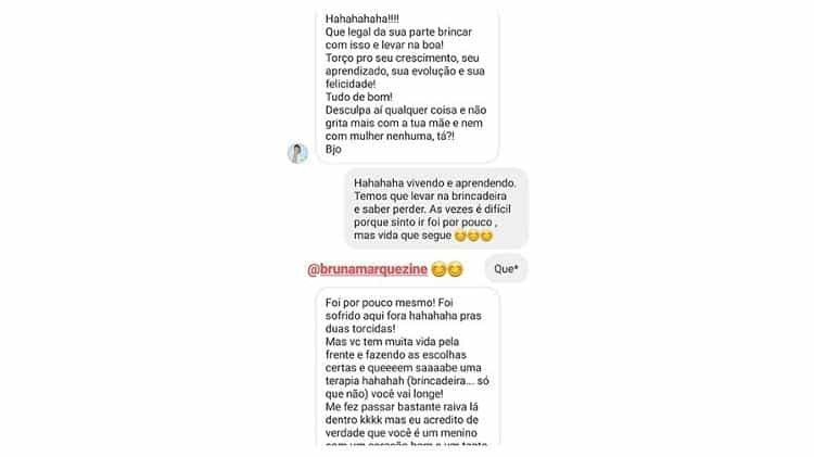 “Que legal da sua parte brincar com isso e levar na boa. Torço para seu crescimento, seu aprendizado, sua evolução e sua felicidade. Tudo de bom. Desculpa aí qualquer coisa e não grita mais com a sua mãe e nem com mulher nenhuma ta?”, escreveu a famosa. O ex-BBB respondeu “vivendo e aprendendo”.
