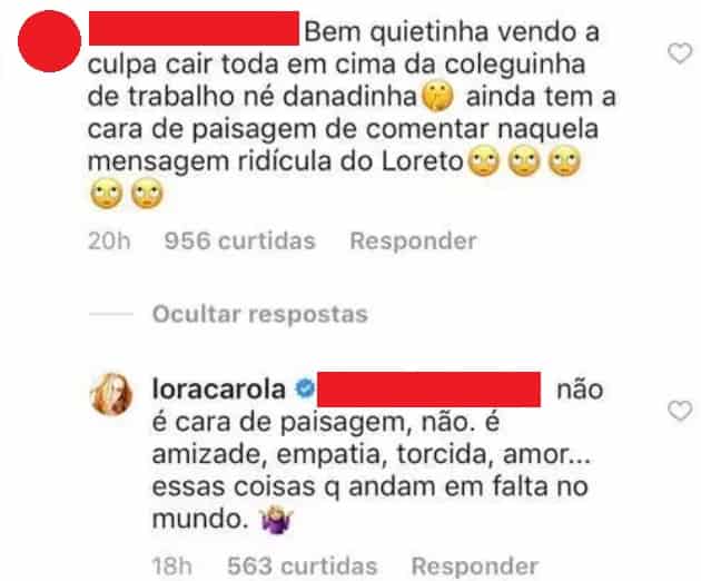Outra internauta foi mais além, afirmando que aquilo se tratava sim de um beijo na boca. “Nunca vi se abraçar com a boca quase grudando na outra. Se isso não foi o beijo, estou louca”. Carolina, então, rebateu: “Foi não, amor. É só o ângulo mesmo. No mais, torço para que tudo fique bem, porque pessoas estão sofrendo com isso”.