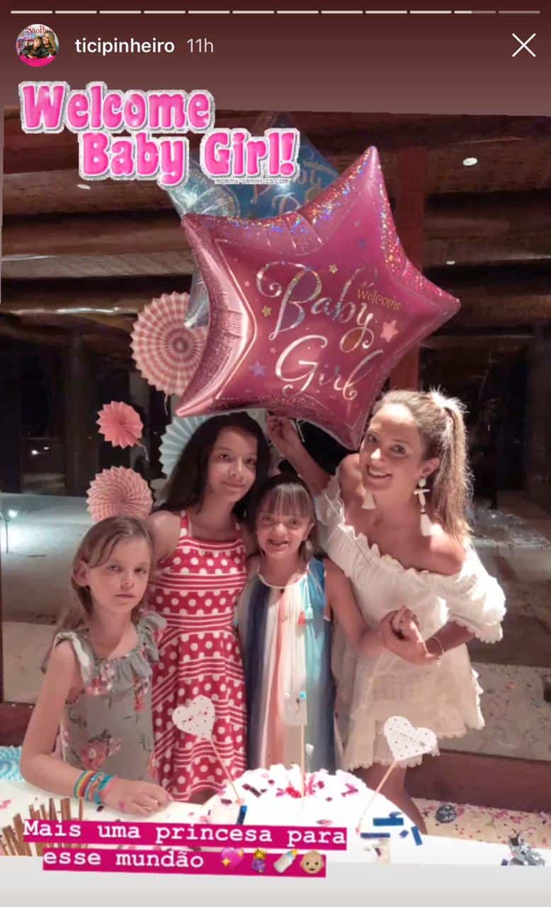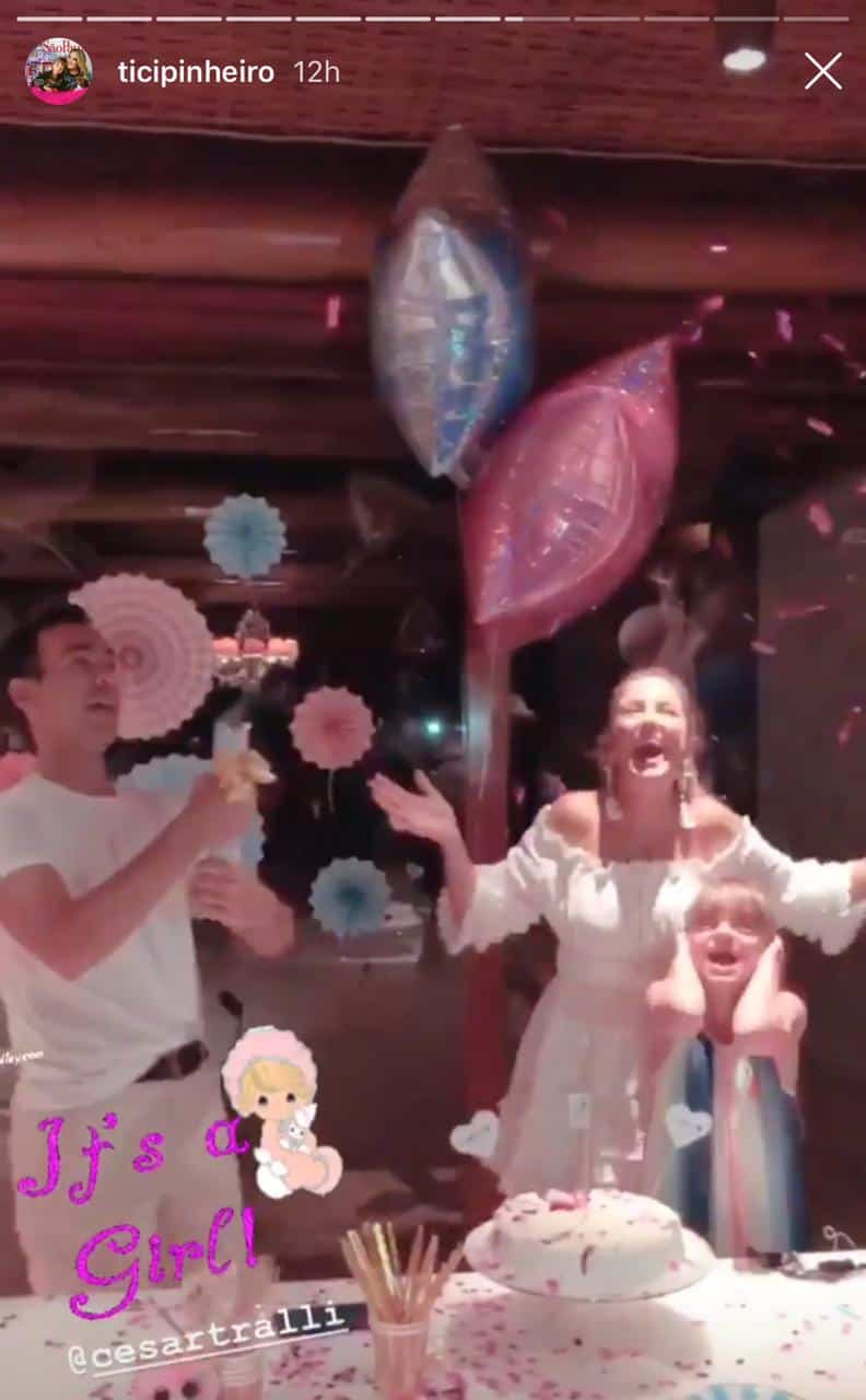 No Instagram Stories, Ticiane compartilhou a decoração da festa, ainda no suspense da revelação do sexo. Pouco tempo depois, a apresentadora anunciou ao lado do esposo e da filha Rafaela, de 9 anos: “Baby girl“, indicando que vem aí uma menina.