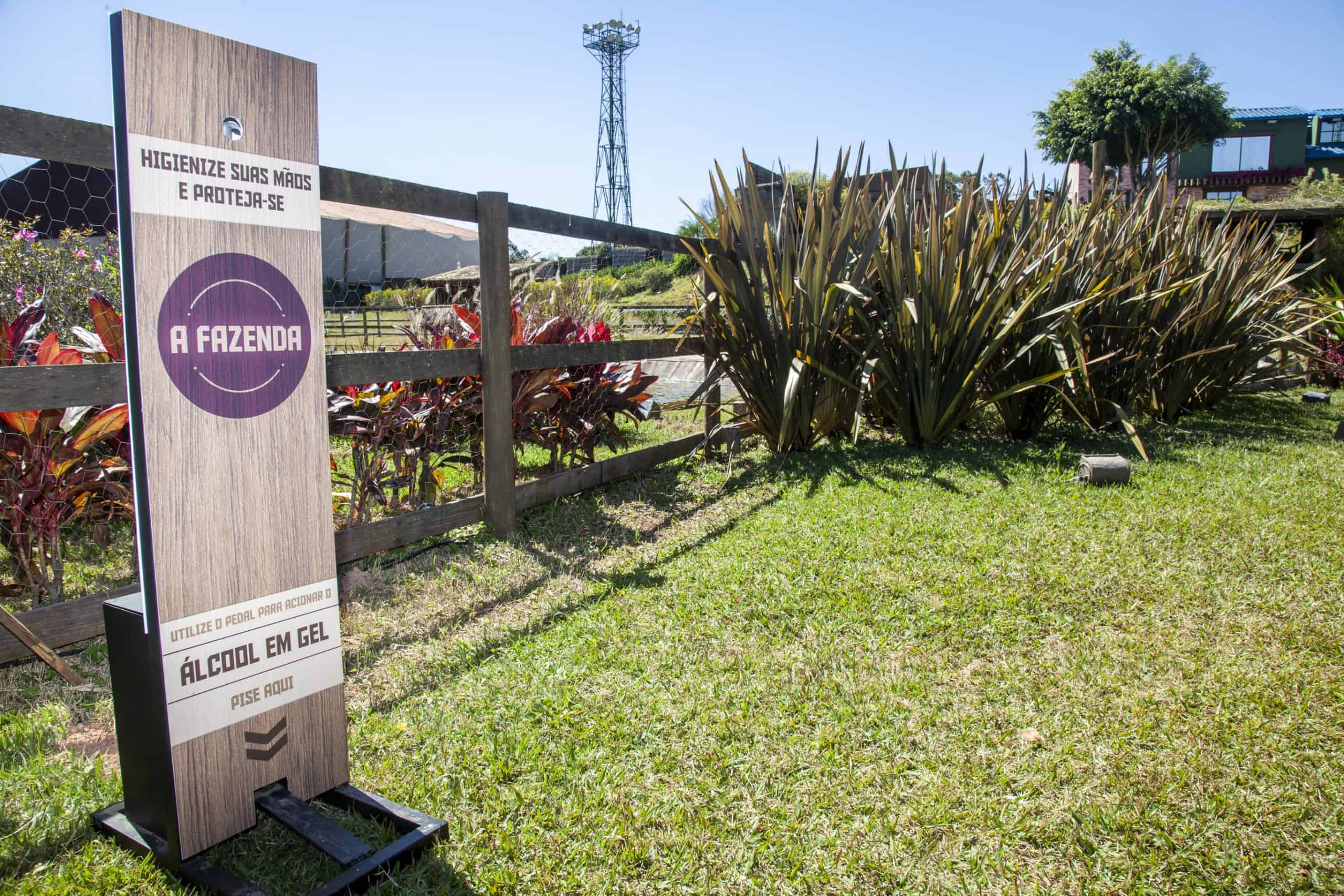 - Dispenser de álcool gel integra nova decoração de A Fazenda 2020 (Imagem: Edu Moraes / Record)
