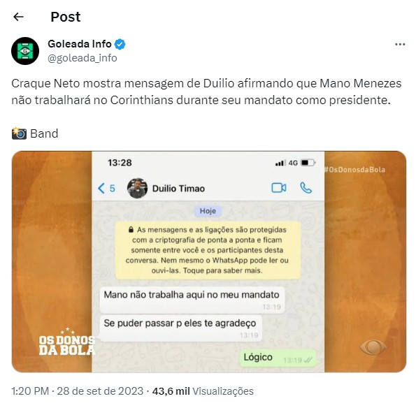 A edição de Os Donos da Bola desta quinta-feira (28) foi quente. Craque Neto não guardou o sentimento a respeito da recusa de Tite e a posterior contratação de Mano Menezes como treinador do Corinthians.