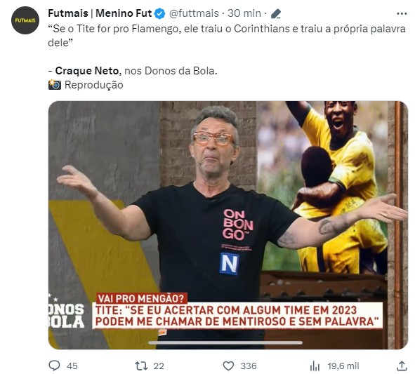 Com uma hora e 30 minutos no ar, Os Donos da Bola teve o alvinegro como foco total. O comunicador expôs vídeos antigos de Tite e Augusto Melo, cotado para a presidência do Corinthians, e criticou a possível ida do treinador para o Flamengo.