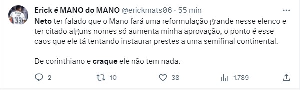 O ex-jogador descartou um bom trabalho de Mano Menezes. Velloso jogou o mesmo pensamento na discussão. Na quarta-feira (27), Neto pediu a demissão de Vanderlei Luxemburgo, o que se confirmou duas horas depois.