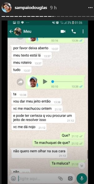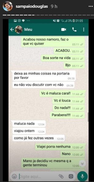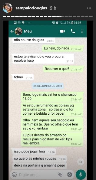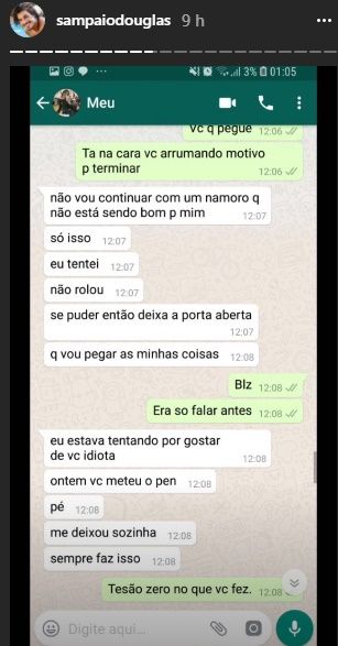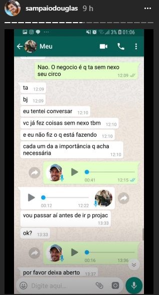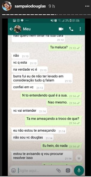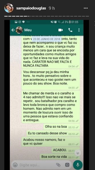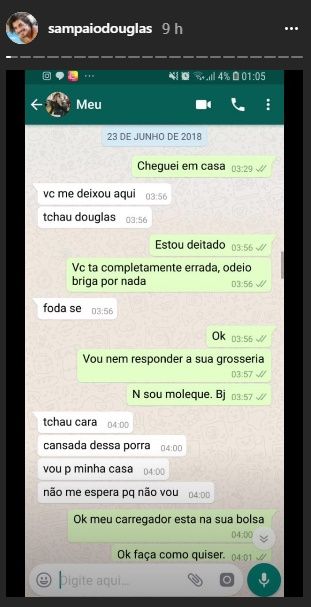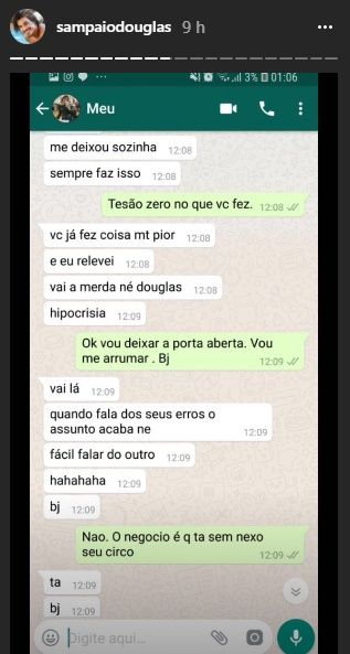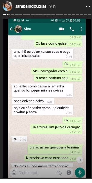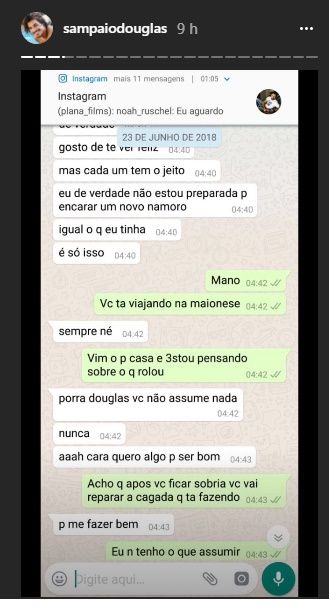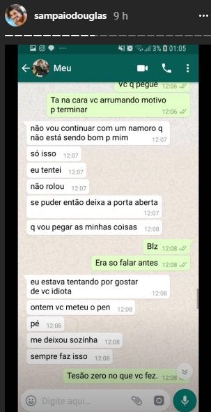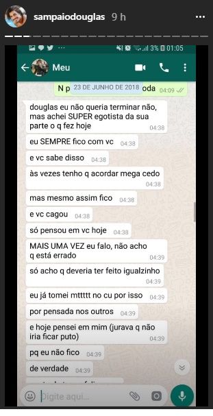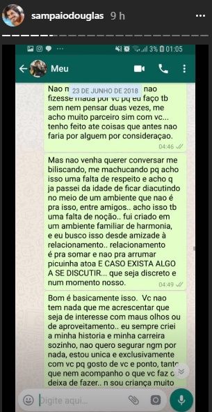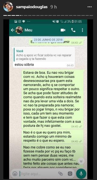 Em seguida, Douglas escreve um textão: “Estava de boa. Eu não vou brigar com você. Acho que houve coisas desnecessárias para que está namorando, acho que se comportar um pouco significa respeitar o outro. Se acha que pode fazer atitudes de como quando está solteira realmente não dá para levar uma vida a dois. Se você não tá preparada para namorar, poxa só jogar limpo, não vou brigar por isso, cada um tem seu momento e tem que fazer o que está com vontade, mas infelizmente com a sua postura de hoje não gostei”.