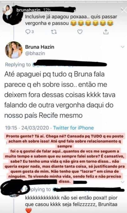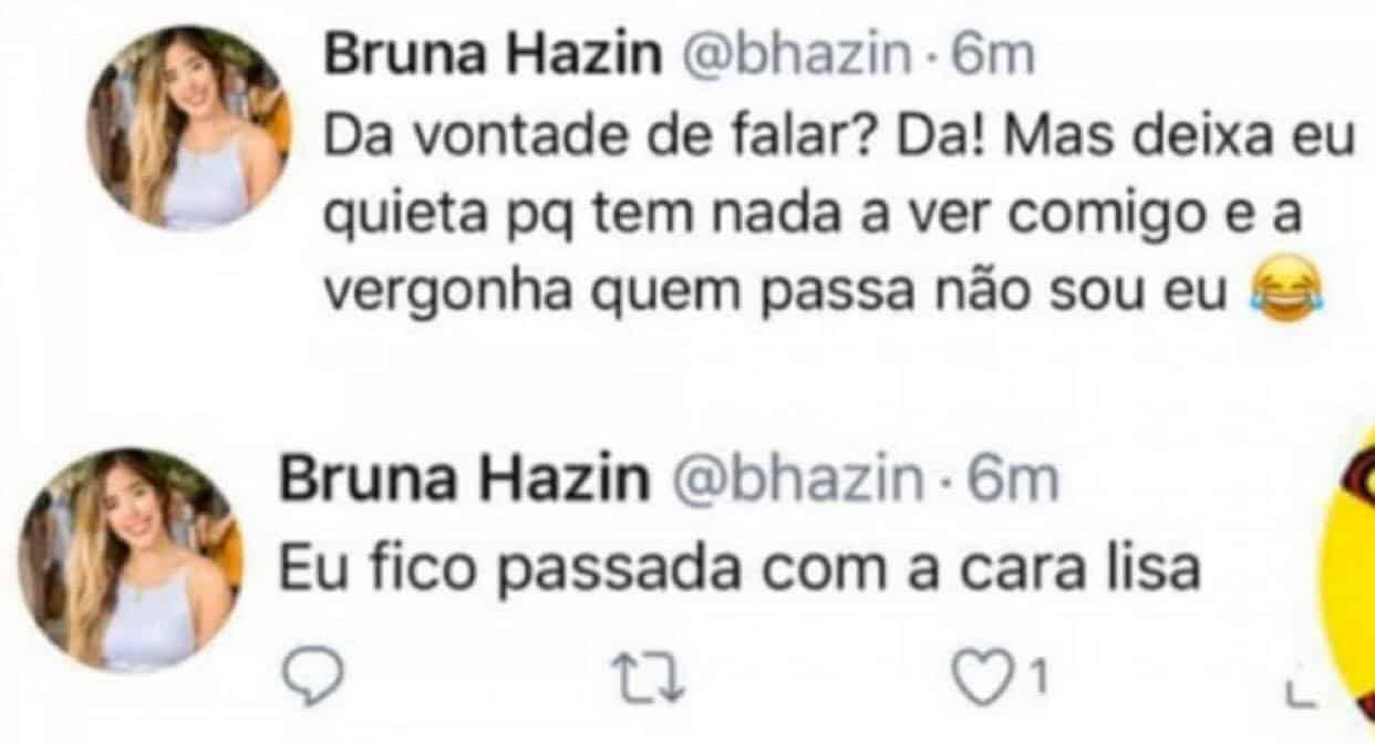 No Twitter, Bruna Hazin, atual de Jonas Esticado, se manifestou com uma indireta. “Dá vontade de falar? Dá! Mas deixa eu quieta porque não tem nada a ver comigo e a vergonha quem passa não sou eu. Eu fico passada com a cara lisa“, disparou.