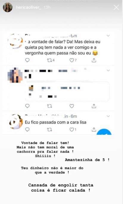 Na sequência, os tweets de Bruna foram postados em uma publicação de Erica com uma resposta. “Vontade de falar tem. Mas não tem moral de uma cachorra para falar nada. Shiiiu! Amantezinha de 5ª. Teu dinheiro não é maior do que a verdade. Cansada de engolir tanta coisa e ficar calada“, rebateu.