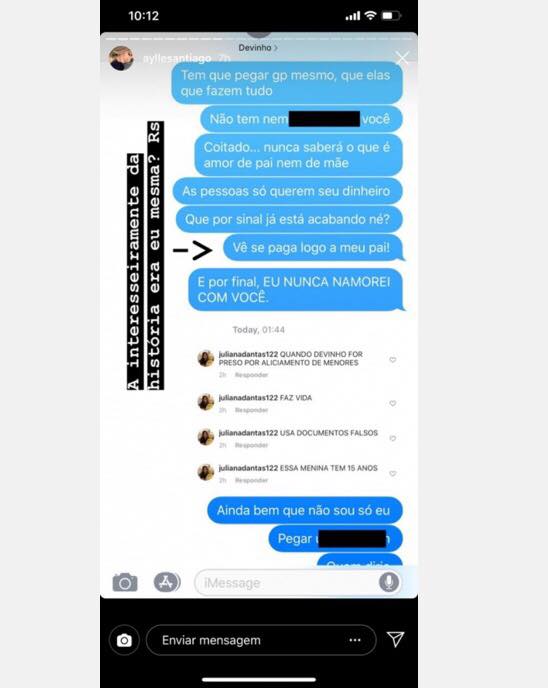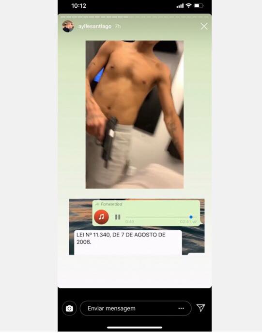 Em outro ponto da conversa dos dois, a modelo diz que o namorado tem dívidas com seu pai e mostrou uma foto que um homem, supostamente Devinho, aparece armado. Na ocasião, o artista se manteve calado.