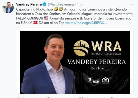 Caprichei no Photoshop! Amigos, novos caminhos à vista. Quando buscarem a casa dos sonhos em Orlando, aluguel, moradia ou investimento, falem comigo. Jornalista sempre e também corretor de imóveis licenciado na Flórida!“, afirmou Vandrey.