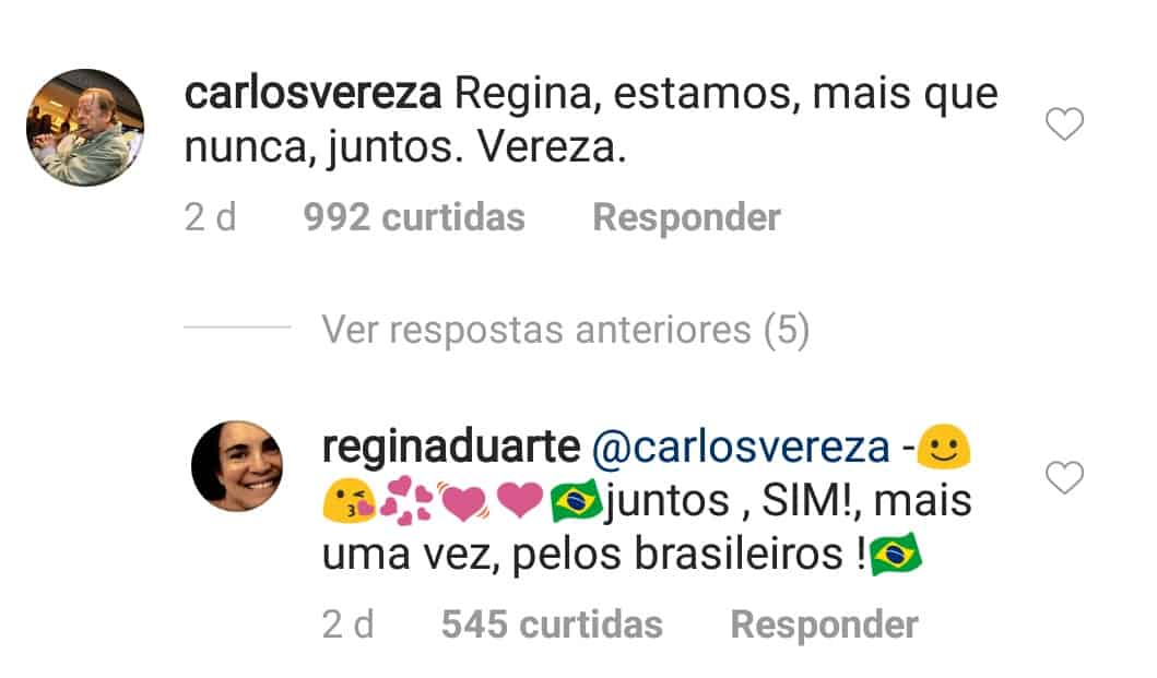 Isabella Fiorentino, apresentadora do SBT, mostrou seu apoio a Regina Duarte. “Minha musa desde sempre”. O ator Carlos Vereza também. “Regina, estamos, mais que nunca, juntos. Vereza”, assinou ele. “Juntos, sim! Mais uma vez, pelos brasileiros!”, respondeu Regina.