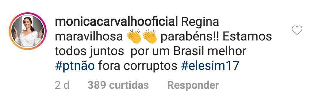 Mônica Carvalho, atriz distante das telinhas, também se manifestou. “Regina maravilhosa, parabéns! Estamos todos juntos por um Brasil melhor. Fora corruptos”, declarou.