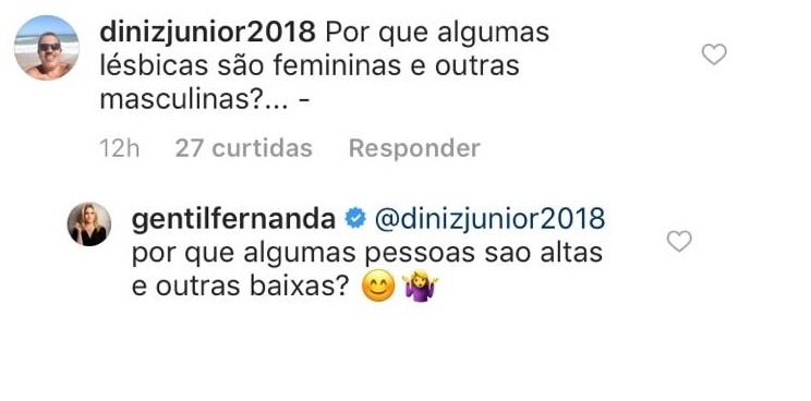 Fernanda não fugiu do embate e respondeu, mas de forma bem elegante e sem provocar polêmicas. “Por que algumas lésbicas são femininas e outras masculinas?“, questionou um seguidor.