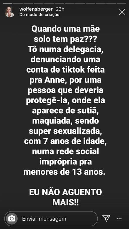 Quando uma mãe solo tem paz? Tô numa delegacia denunciando uma conta de TikTok feita para a Anne, por uma pessoa que deveria protegê-la, onde ela aparece de sutiã, maquiada, sendo super-sexualizada, com 7 anos de idade, numa rede social imprópria para menores de 13 anos. Eu não aguento mais”, desabafou Nicole.