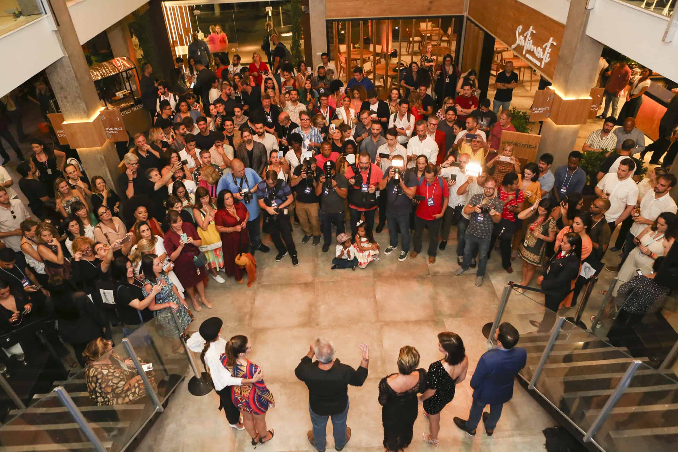 Depois da ventania, os convidados seguiram para o Empório Delícia, o complexo gastronômico administrado por Helena, personagem de Flávia Alessandra. O espaço possui um amplo mezanino e é inspirado nos grandes centros gastronômicos do Brasil e do exterior.