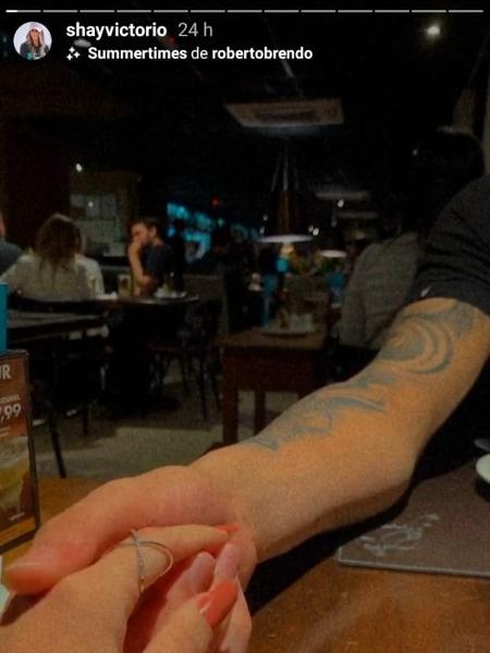 Apesar de todos já saberem que estão juntos, Shayene (nome verdadeiro) ainda faz um certo mistério e não mostra o rosto do boy. No Instagram Stories, ela postou foto de um jantar com o goleiro e só exibiu o braço tatuado do jogador.