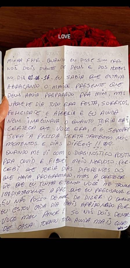 “Quando me vi com o diagnóstico positivo para Covid, fiquei meio nervoso, percebi que teria dias diferentes do que havia programado. A certeza de que eu tinha, e tenho, você trouxe a paz que eu precisava. E não posso deixar de dizer o quanto eu estou cada dia mais apaixonado por você“, concluiu.