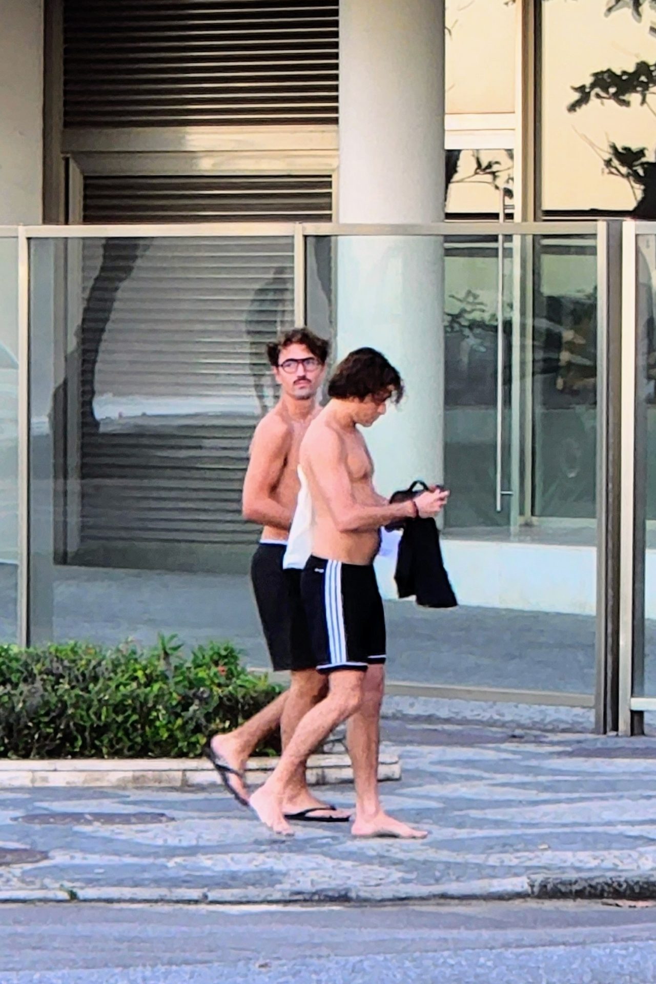 Os dois saíram dali depois de colocarem suas bermudas pretas e apesar de perceberem que estavam sendo clicados, não demonstraram se importar muito.