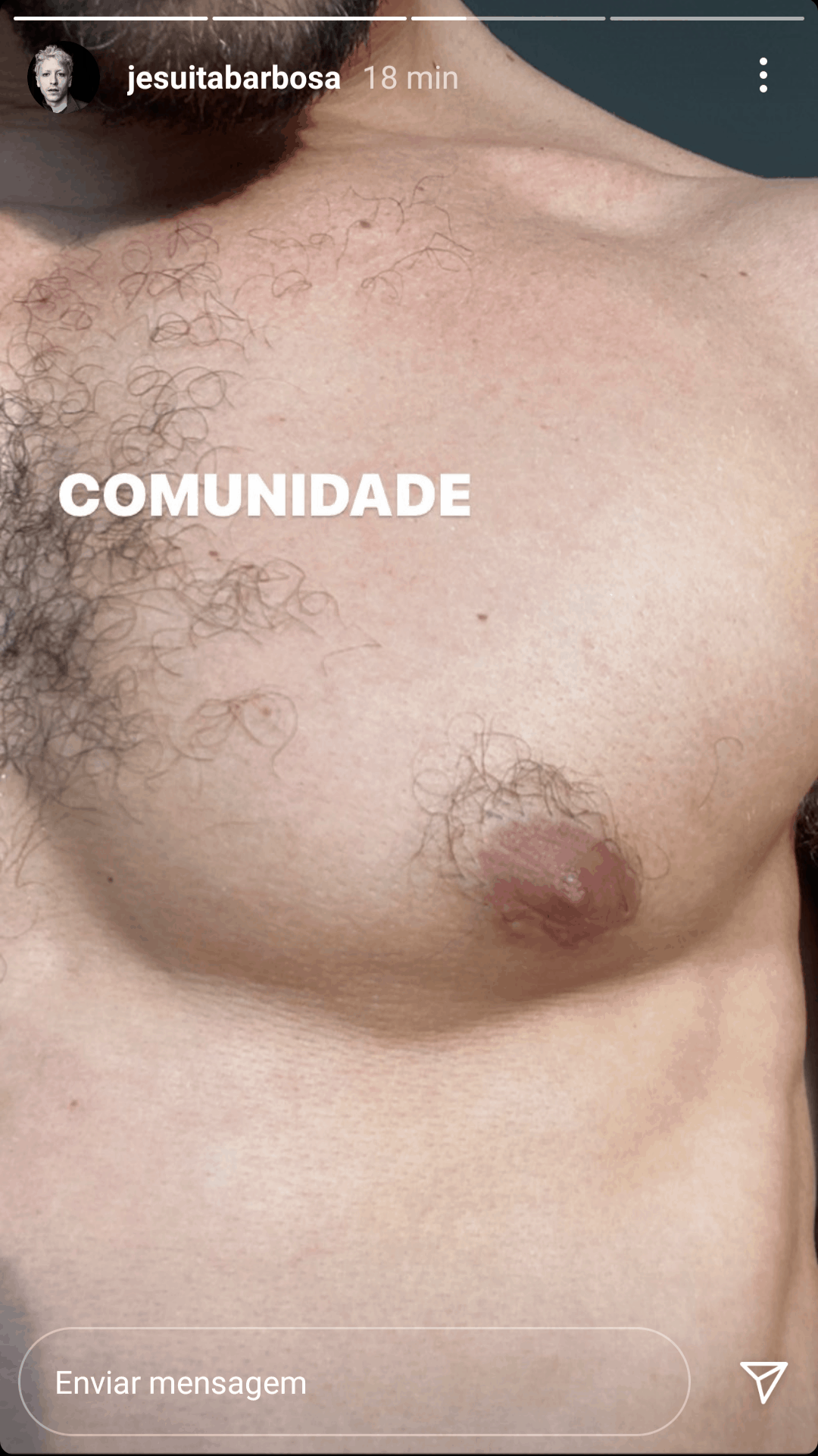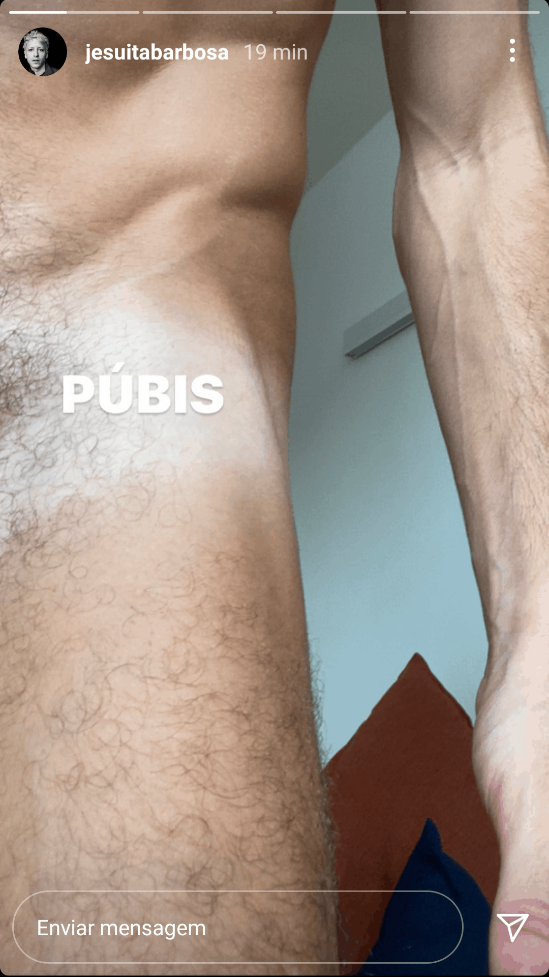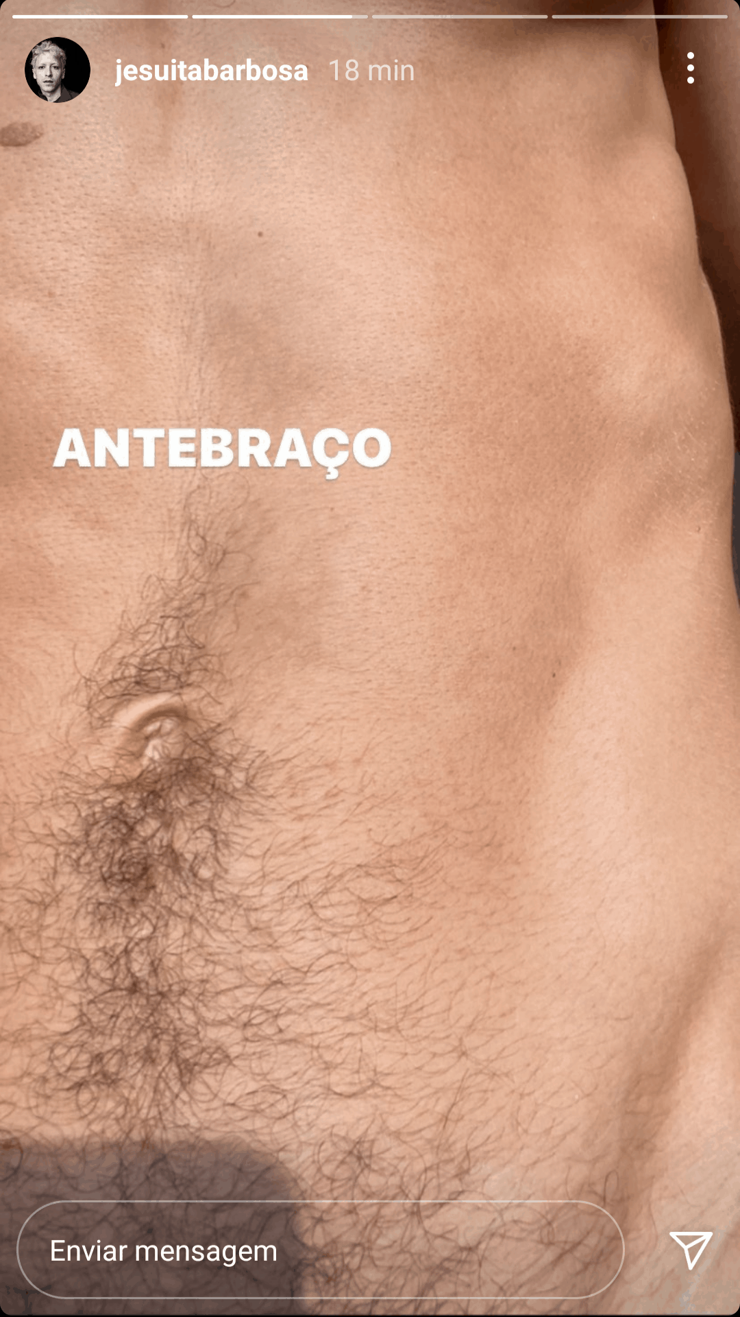 O famoso atribuiu legendas aos quatro cliques. No primeiro, em que evidenciou virilha e coxa, Jesuita Barbosa escreveu “púbis”. Já na imagem do abdômen, ele atribuiu a palavra “antebraço”. A foto do peitoral e do mamilo esquerdo trouxe “comunidade”. Por fim, a dos glúteos, contou com “diretriz”.