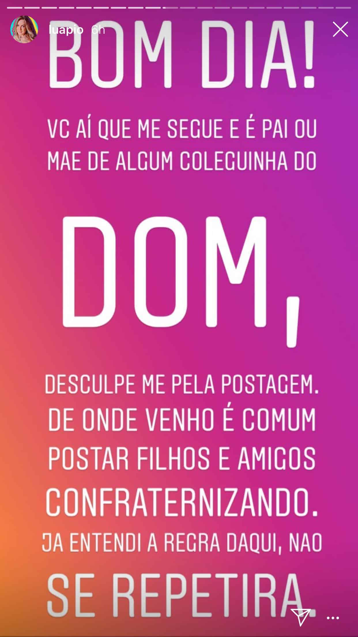 Bom dia! Você que me segue e é pai ou mãe de algum coleguinha do Dom, desculpe-me pela postagem. De onde venho é comum postar filhos e amigos confraternizando. Já entendi a regra daqui, não se repetirá“, escreveu Luana.