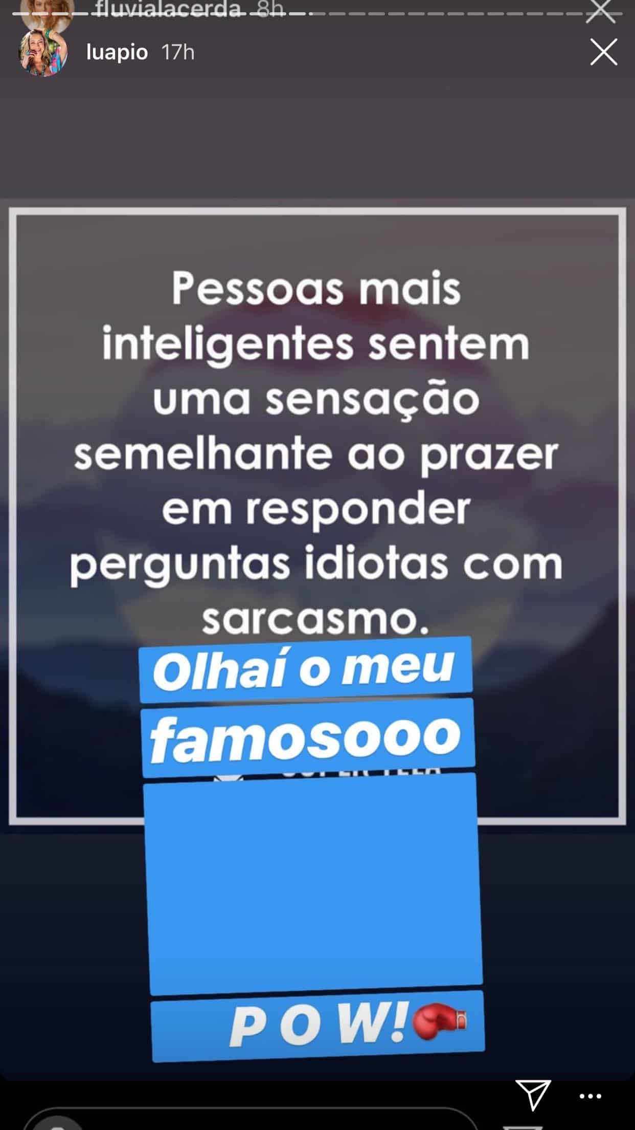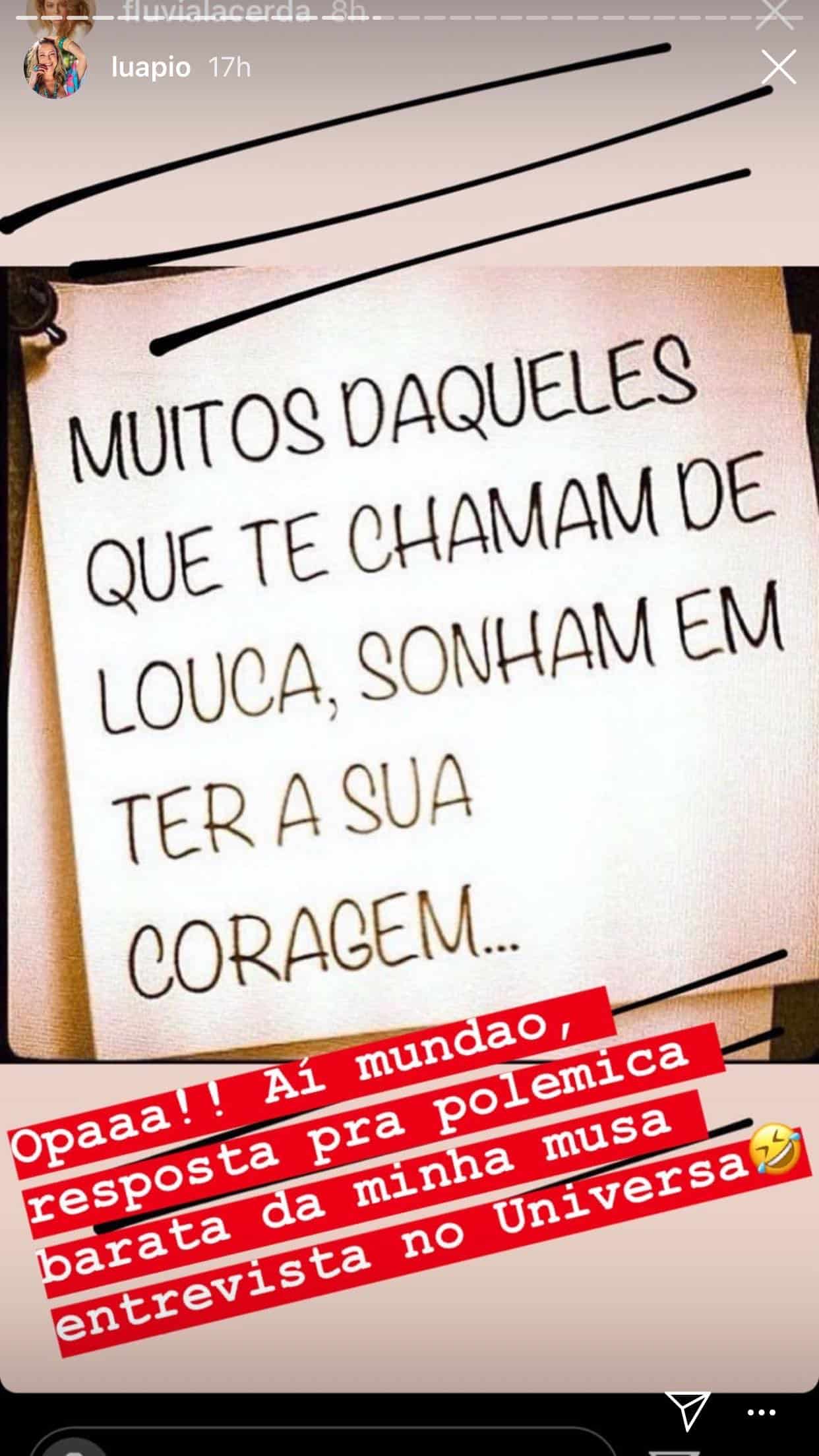 Não satisfeita com suas palavras, Luana ainda repostou dois posts da influencer Flavia Lacerda, que a defendeu. “Muitos daqueles que te chamam de louca, sonham em ter sua coragem“, afirmava uma publicação. “Opa! Aí mundão, resposta pra polêmica barata da minha musa entrevista no Universa“, completou Luana.