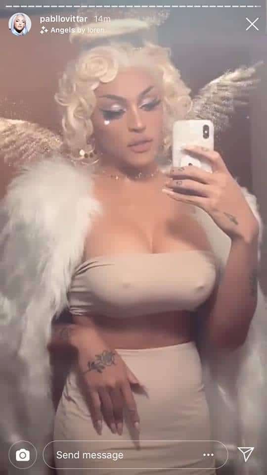 Pabllo Vittar também aproveitou para aumentar a temperatura de seus seguidores ao surgir em frente ao espelho só de top e calcinha reboando e fazendo caras e bocas. Além do modelo ousado, a intérprete de “Sua Cara” usou filtros que a deixaram de asas com auréolas de anjo.