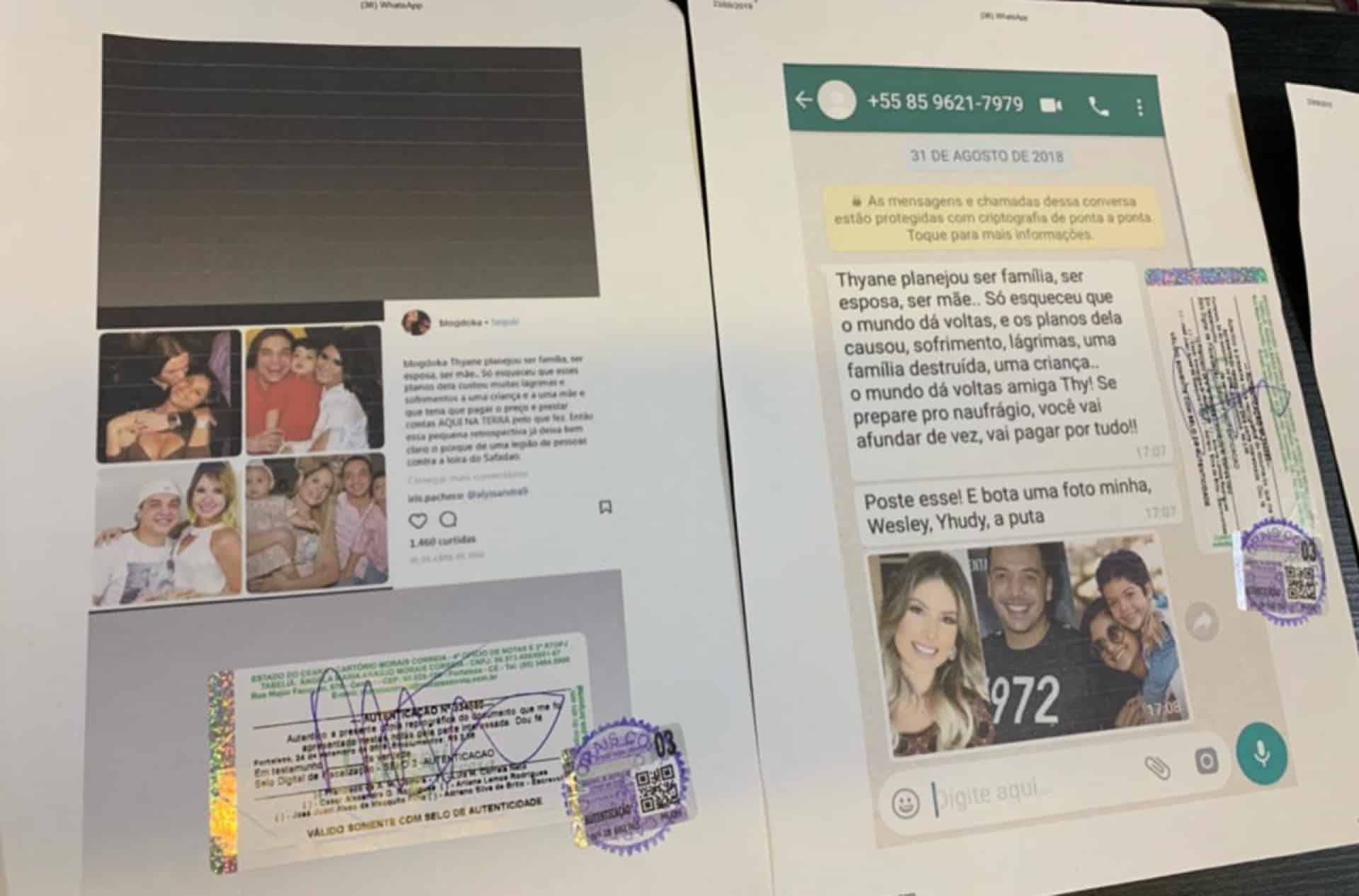 Em uma das mensagens, que foi enviada em 31 e agosto do ano passado, a mandante dizia: “Thyane planejou ser família, ser esposa, ser mãe… Só esqueceu que o mundo dá voltas e o plano dela causou sofrimento, lágrimas, uma família destruída, uma criança… o mundo dá voltas, amiga Thy! Se prepare pro naufrágio, você vai afundar de vez, vai pagar por tudo”.