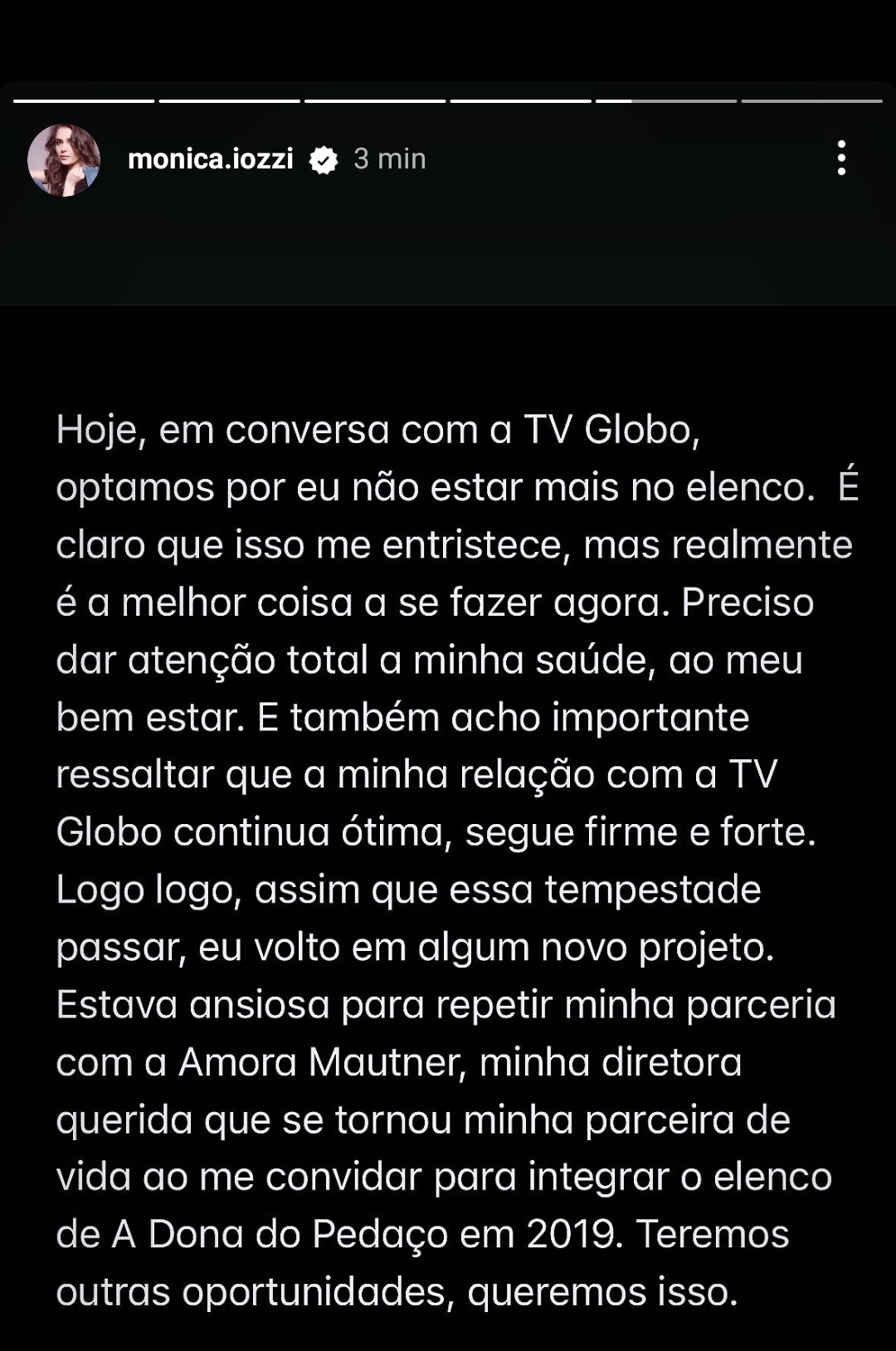 Acompanhada por uma equipe médica, a então contratada da Globo deixou claro que a doação de 100% do seu tempo para as gravações seria impossível. “Hoje, e conversa com a Globo, optamos por não estar mais no elenco”, esclareceu.