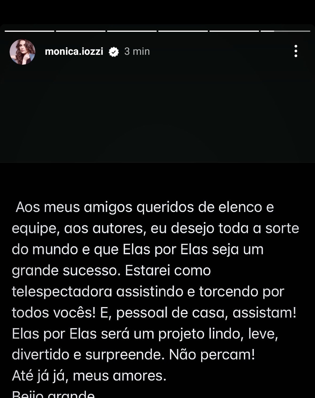 No Instagram, a famosa lembrou que sua carreira sempre foi pautada pela transparência com o público. “Por isso estou aqui, agora, para contar que estou saindo do elenco da novela Elas por elas, por questões de saúde”, começou.