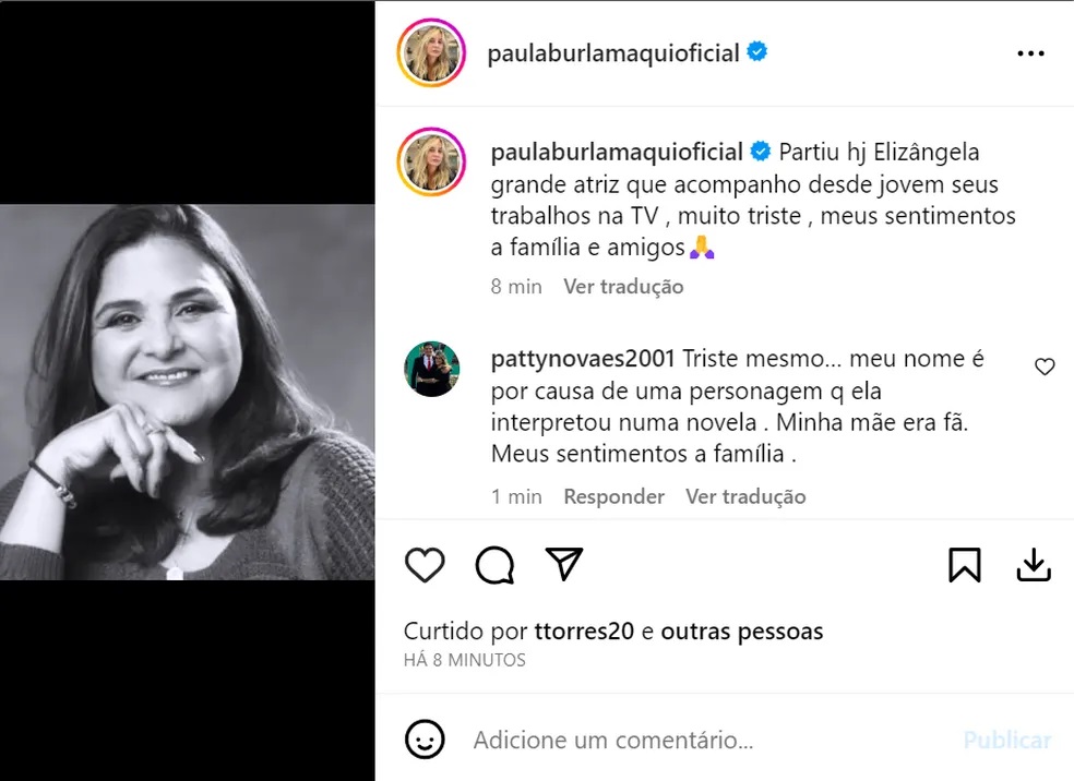 Paula Burlamaqui lamentou a morte da colega de profissão e destacou que era telespectadora assídua dela desde jovem. “Muito triste. Meus sentimentos a família e amigos”, desejou no Instagram.