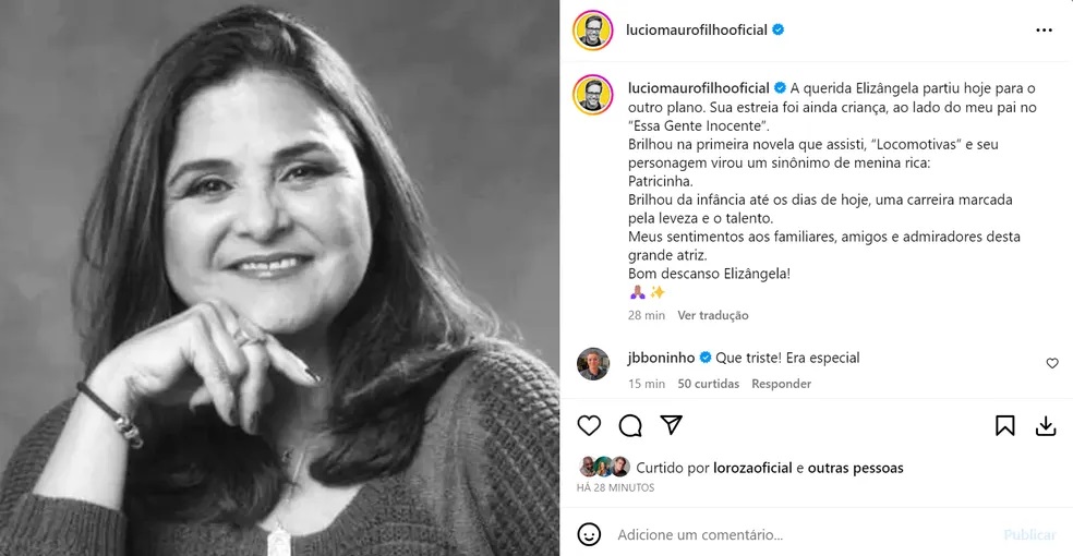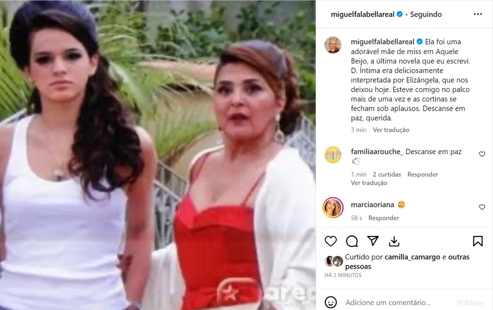 Gloria Perez, autora que deu a Elizangela o seu último grande papel na televisão, não segurou a emoção com a notícia. “Amiga, inteligente, Divertida, aquela atriz visceral, sonho de qualquer autor: vestia sem medo nem pudor a pele das personagens. Estou sem palavras”, declarou.