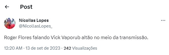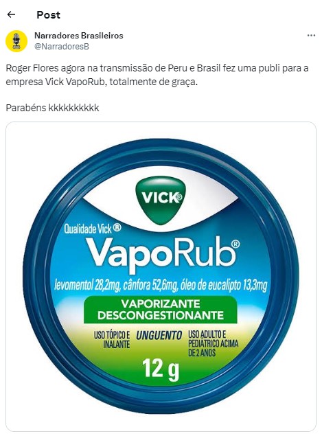 Para a surpresa do departamento comercial da emissora, Roger Flores citou o Vick Vaporub, produto que ajuda no alívio de congestão nasal e que aparentemente foi usado por Neymar antes da volta ao gramado.