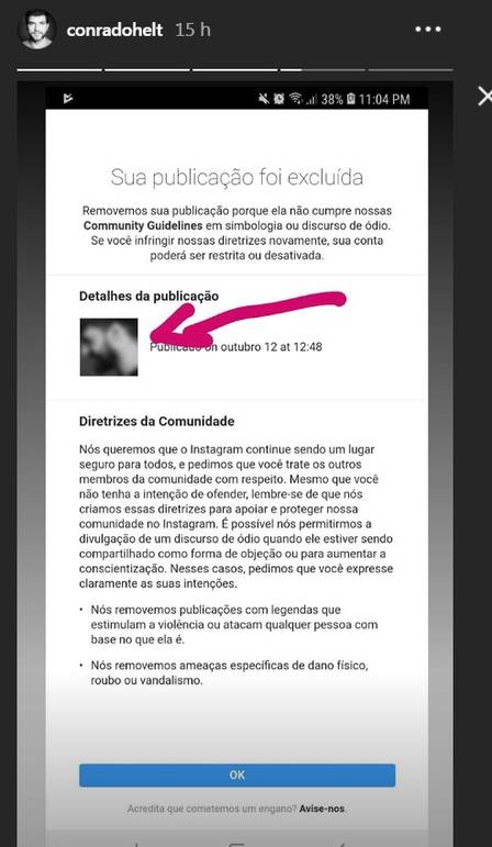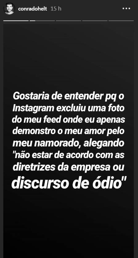 “Gostaria de saber por que o Instagram excluiu uma foto do meu feed, onde eu apenas demonstro o meu amor pelo meu namorado, alegando não estar de acordo com as diretrizes da empresa ou discurso de ódio“, escreveu. Após o ocorrido, Conrado publicou três fotos ao lado do namorado. Em uma delas, os dois estavam se beijando.