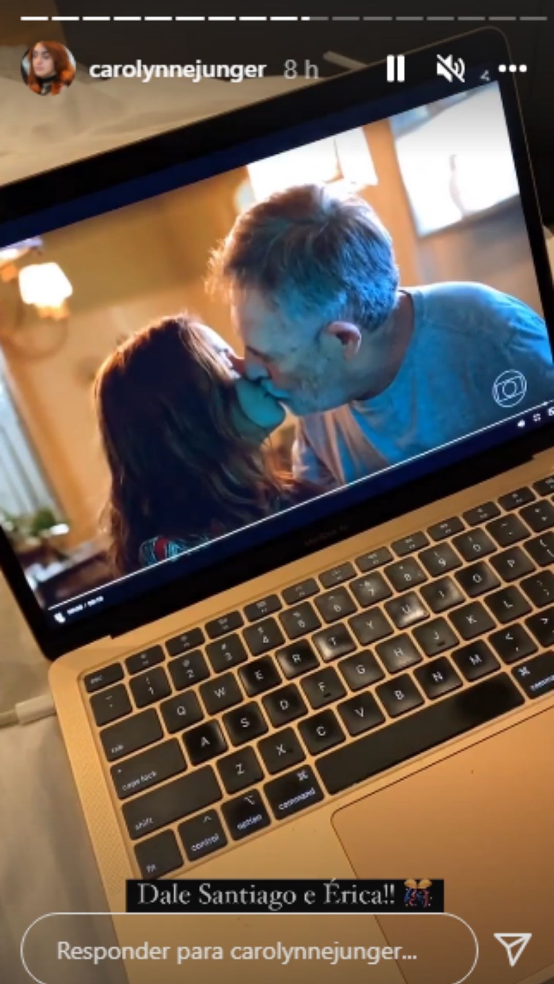 E nos Stories, a famosa escreveu: “Dá-lhe Santiago e Erika”. Na ocasião, ela citou a personagem personal trainer que se envolve com o empresário, interpretado pelo seu noivo.