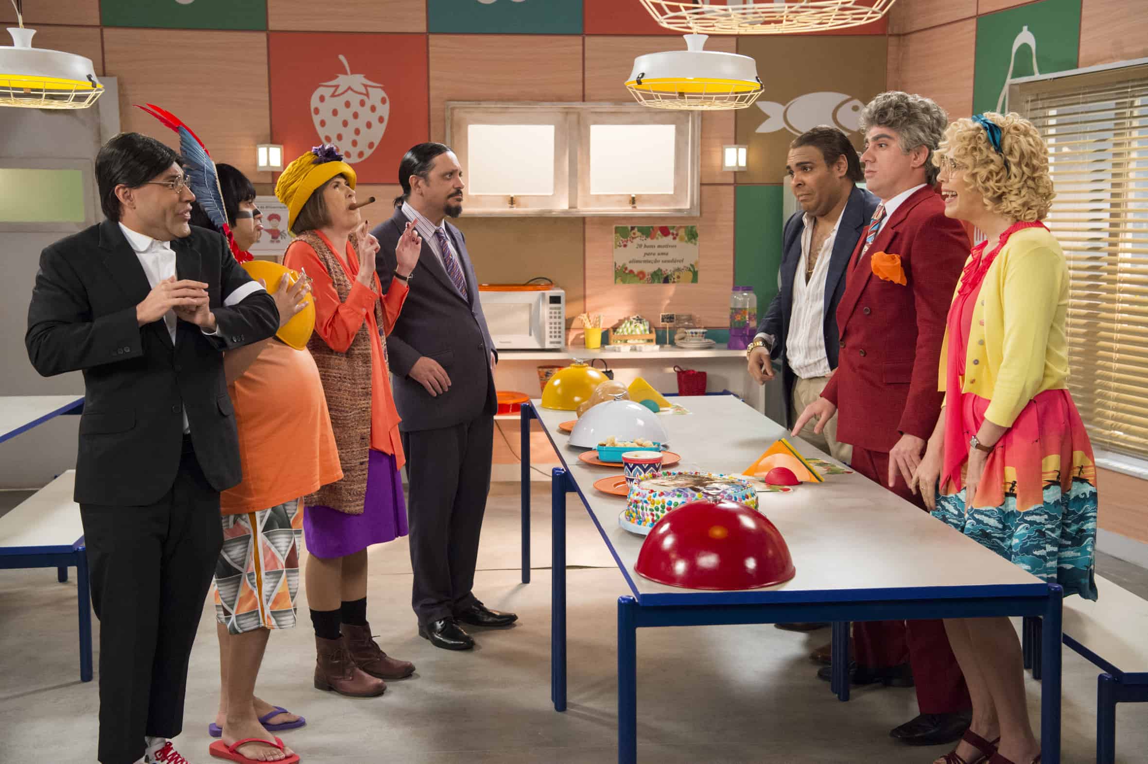 - Seu Batista (Rodrigo Sant’Anna), Suppapou Uaci (Welder Rodrigues), Dona Catifunda (Dani Calabresa), Aldemar Vigário (Lúcio Mauro Filho), Seu Fininho (Paulo Vieira), Cândida (Maria Clara Gueiros) e Rolando Lero (Marcelo Adnet) no novo refeitório da escola (Imagem: Divulgação / Globo)