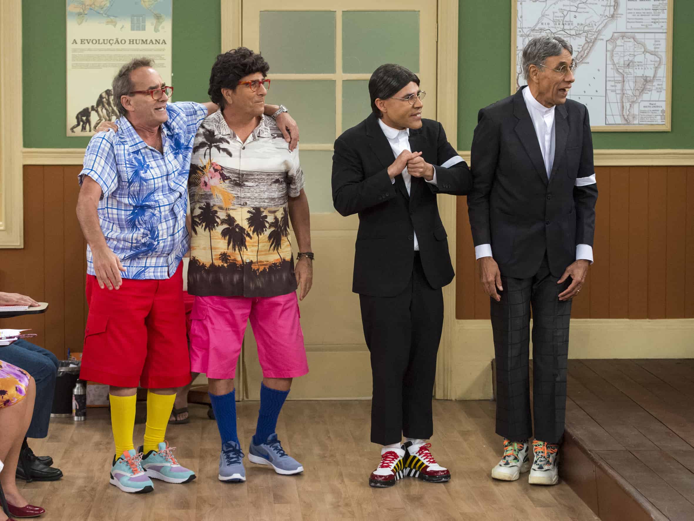- Armando Volta (Evandro Mesquita) e Batista (Rodrigo Sant’Anna) convocam seus parentes; Dindo Batista (Eliezer Motta) e tio Armando Volta (David Pinheiro) para visita à “Escolinha” (Imagem: Divulgação / Globo)