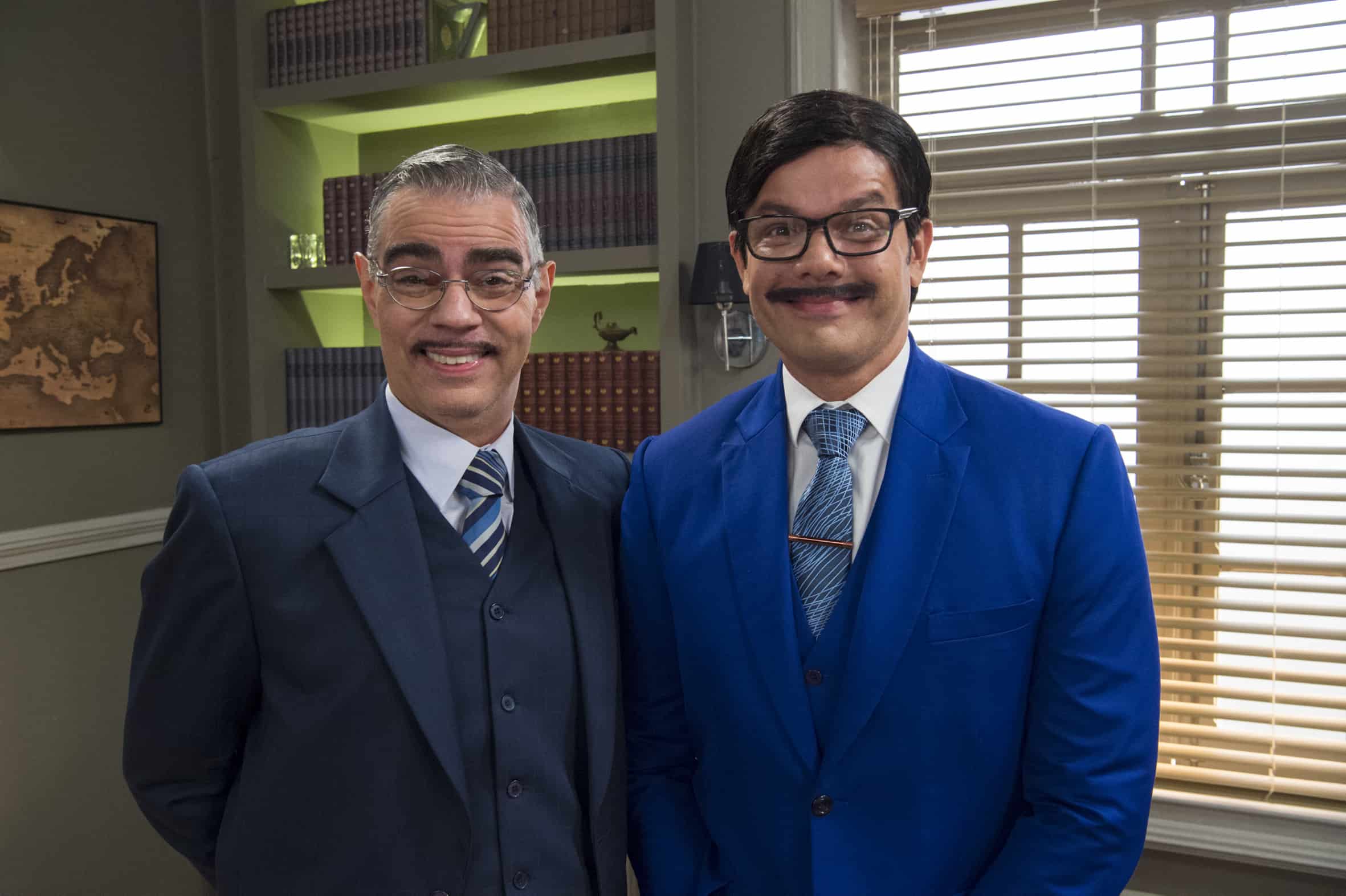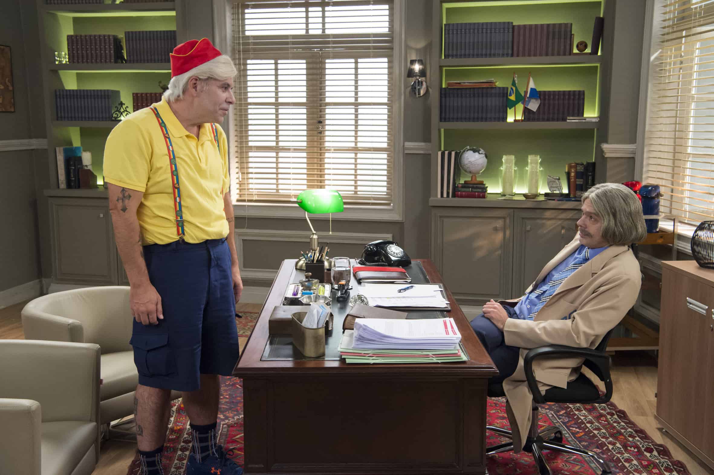 - Professor Raimundo (Bruno Mazzeo) e Mazarito (Leandro Hassum) na nova sala da direção (Imagem: Divulgação / Globo)