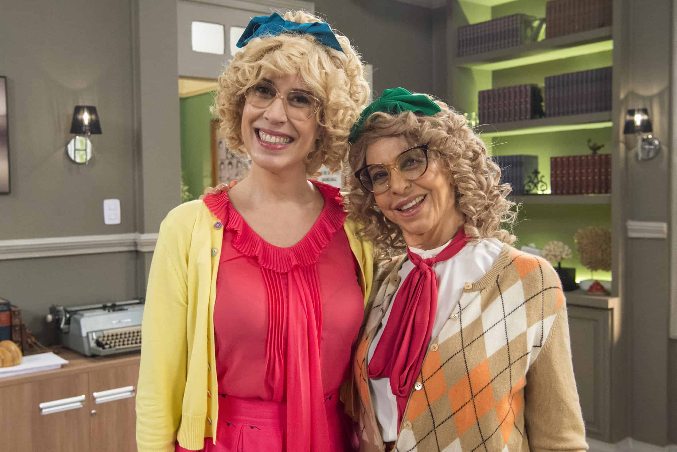 - Cândida (Maria Clara Gueiros) e Tia Cândida (Stella Freitas) se encontram na sala da direção (Imagem: Divulgação / Globo)