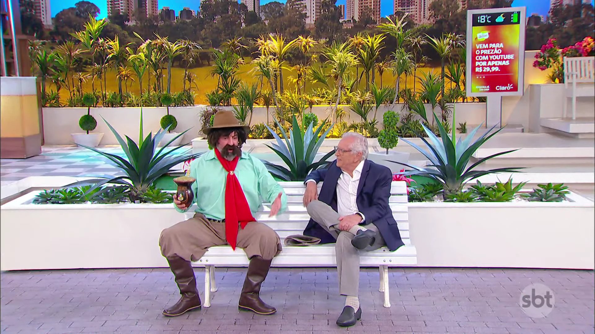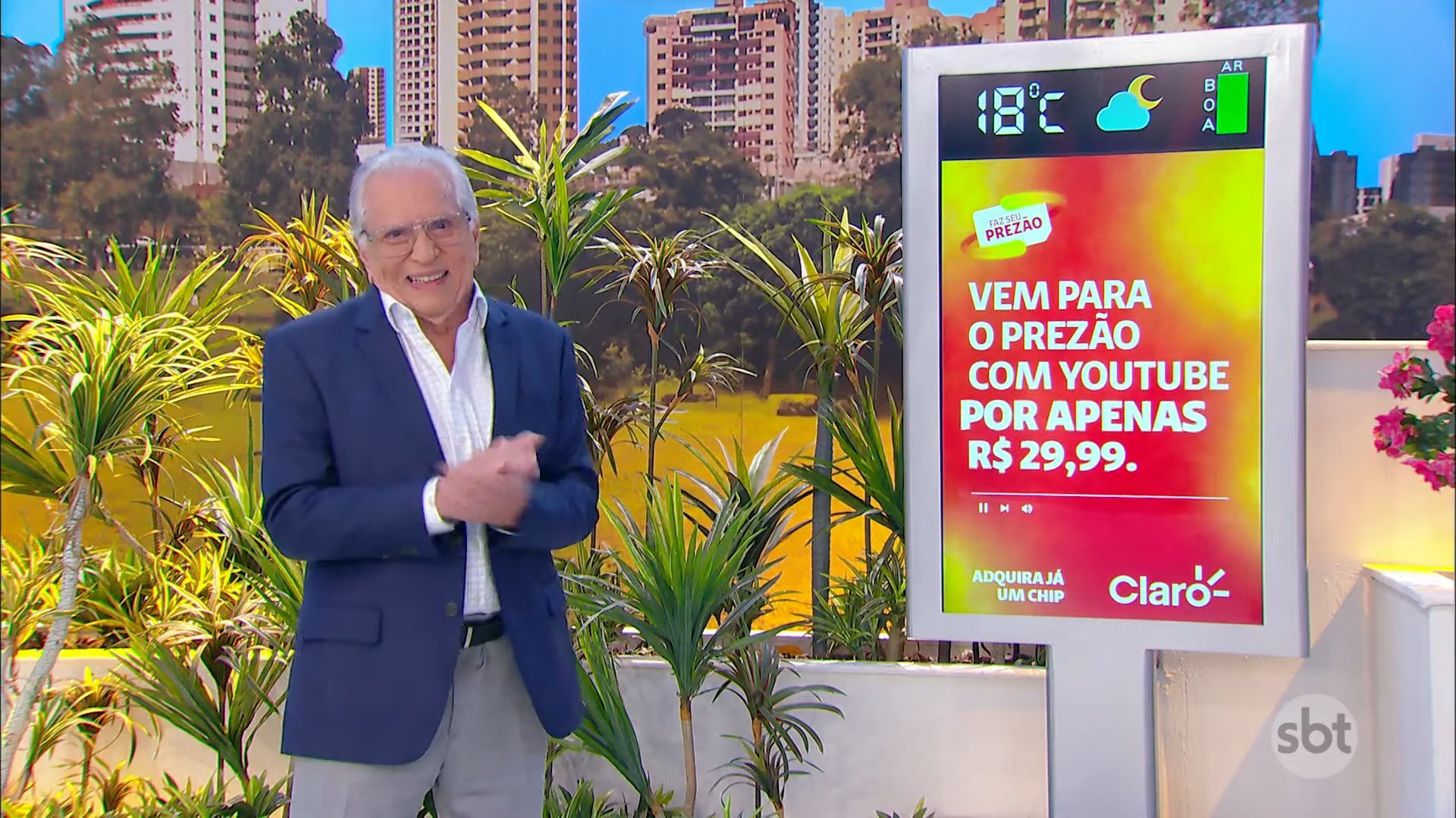 A primeira propaganda foi de uma operadora de celular e internet. Carlos Alberto de Nóbrega fez algo raro: saiu do banco da Praça e apareceu ao lado do telão. O merchan durou alguns segundos, mas o suficiente para encher o cofre do SBT.