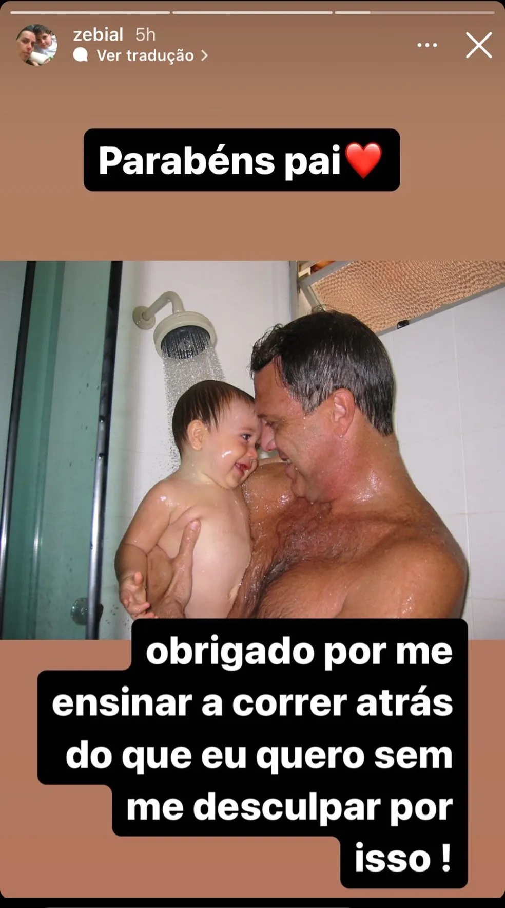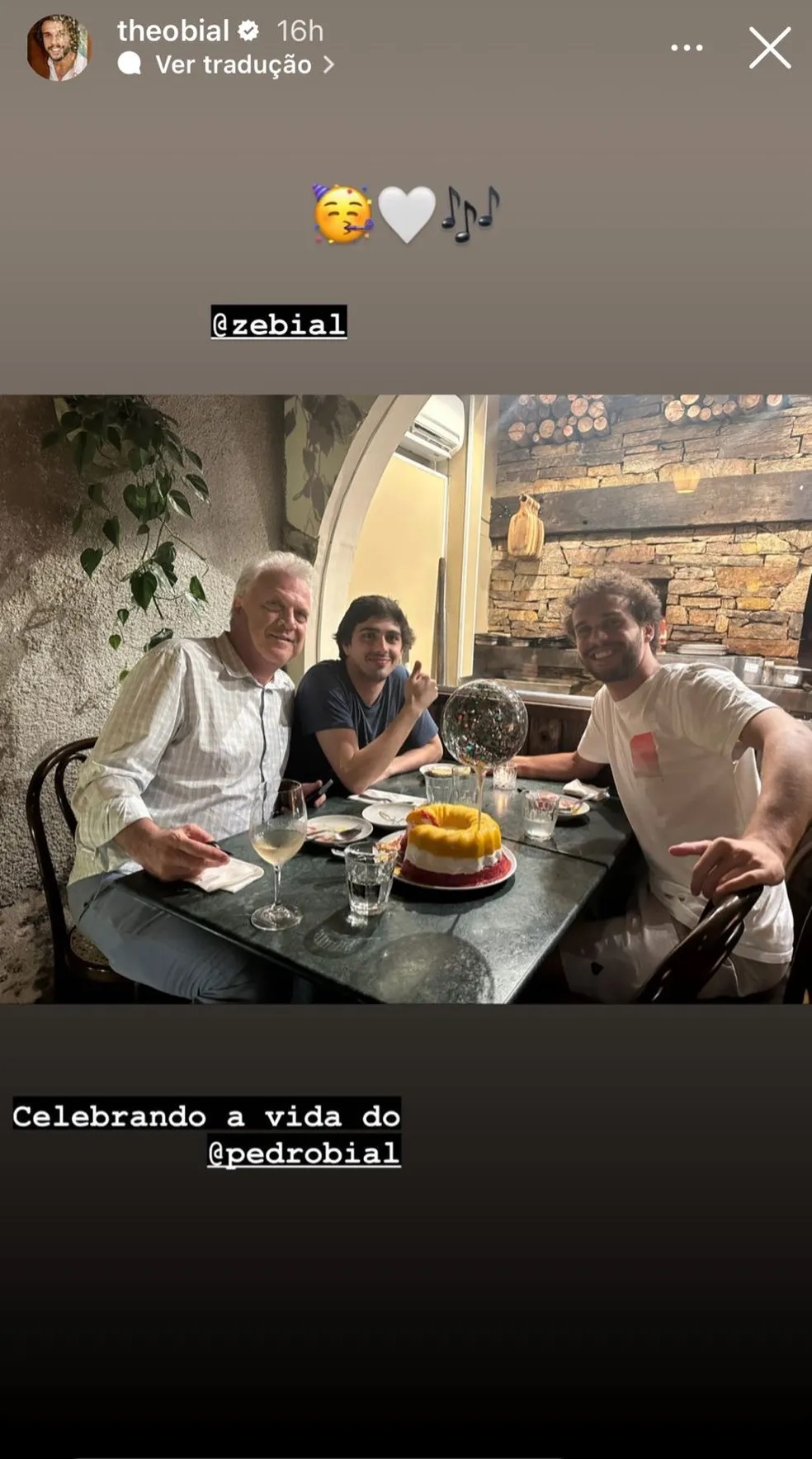 Os rapazes publicaram fotos no stories do Instagram. Em celebração pela vida do patriarca, os dois causaram emoção. “Celebrando a vida do Pedro Bial”, contou Theo. “Parabéns, pai. Obrigado por me ensinar a correr atrás do que eu quero sem me desculpar por isso”, expressou José.