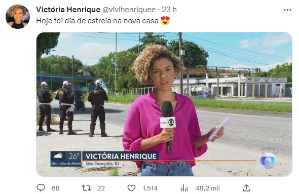 Em sua primeira entrada ao vivo, Victória apareceu no RJ1, telejornal local da hora do almoço do Plim Plim. Feliz da vida, a repórter celebrou o momento com uma publicação em sua rede social. O link foi feito direto de São Gonçalo, no RJ.