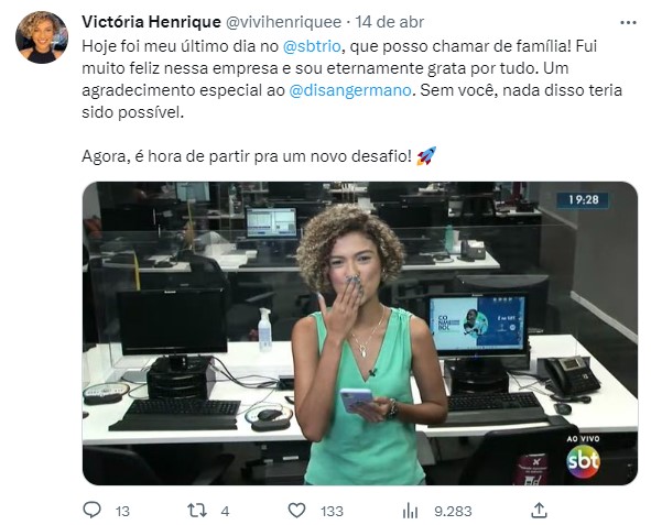Em seu texto de despedida da emissora de Silvio Santos, a jovem agradeceu Diego Sangermano, diretor de Jornalismo do canal no Rio de Janeiro.